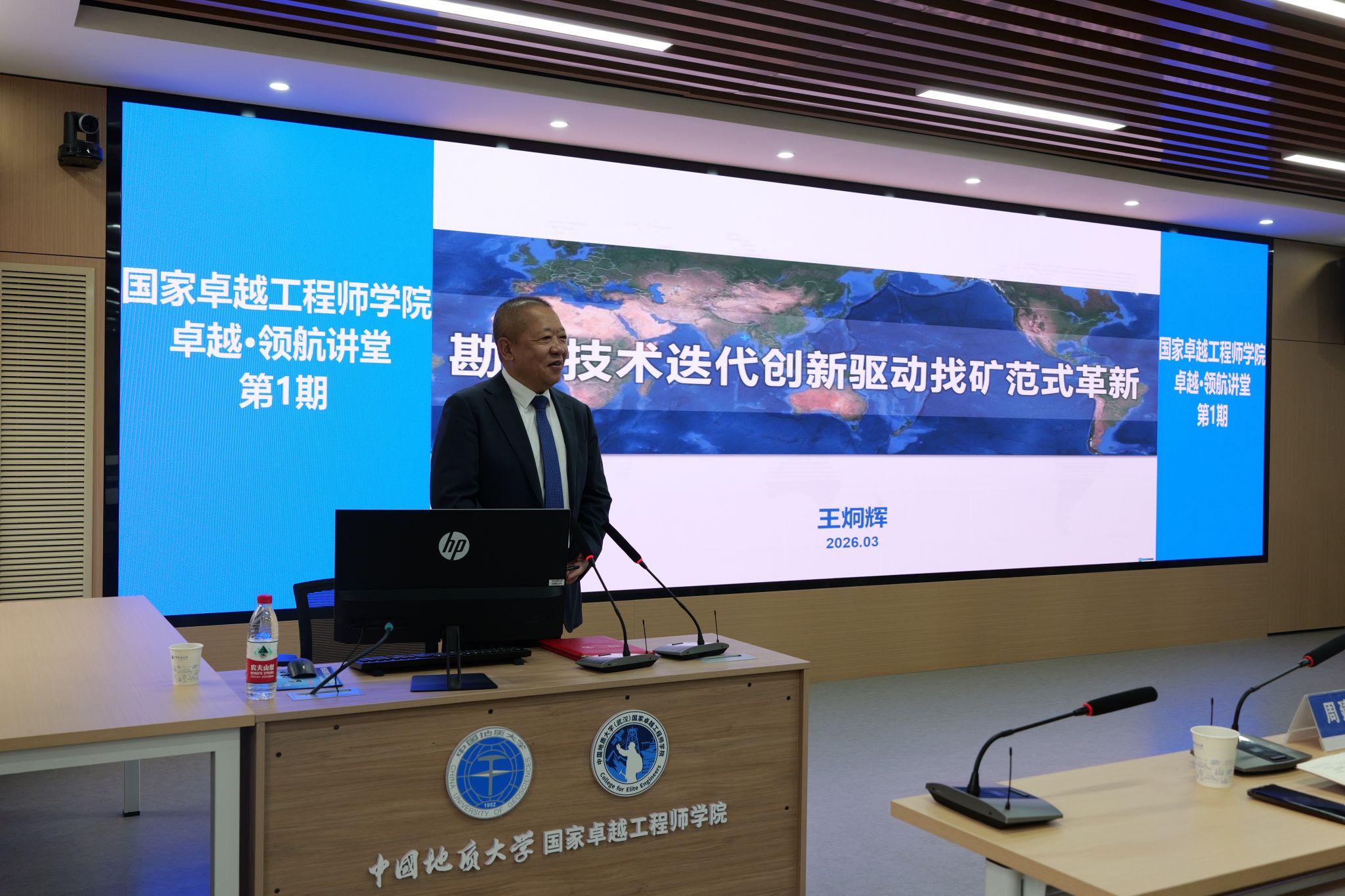 (通讯员:郭玲)2026年3月18日上午,国家卓越工程师学院“卓越·领航讲堂”首场讲座在南望山校区学海楼225会议室顺利举行。本次讲堂特邀战略矿产行业“领航者”、中国五矿首席技术专家王炯辉研究员担任主讲嘉宾,以《勘查技术迭代创新驱动找矿范式革新》为题,带来一场兼具前沿性与实践性的学术报告。副校长章军锋,地球与行星科学学院、资源学院、地球物理与空间信息学院、自然资源调查研究院及国家卓越工程师学院等单位师生近百人现场聆听报告,国家卓越工程师学院院长周建伟主持讲座。
